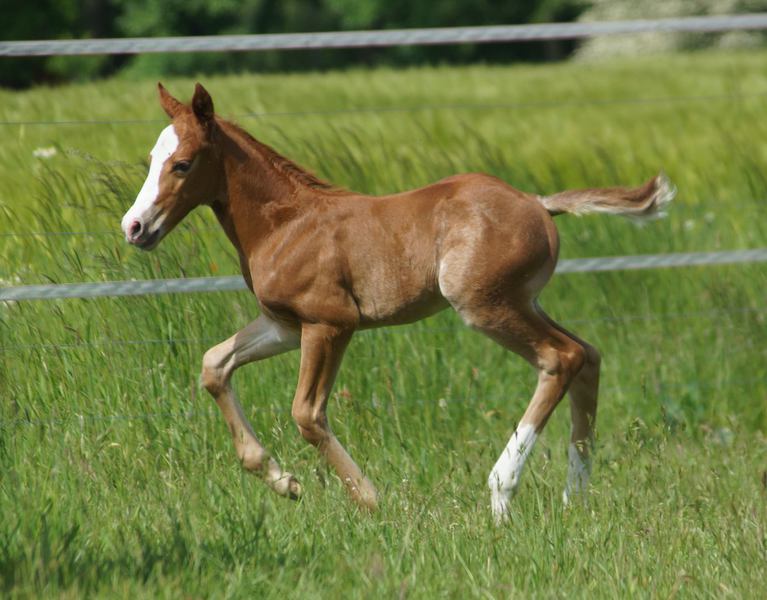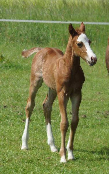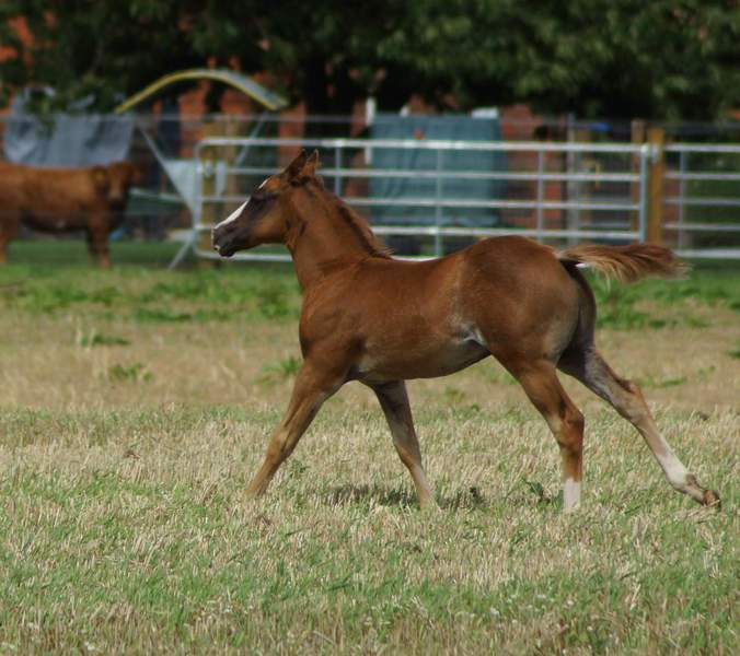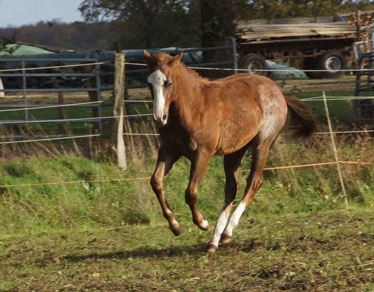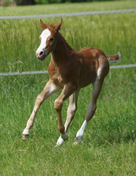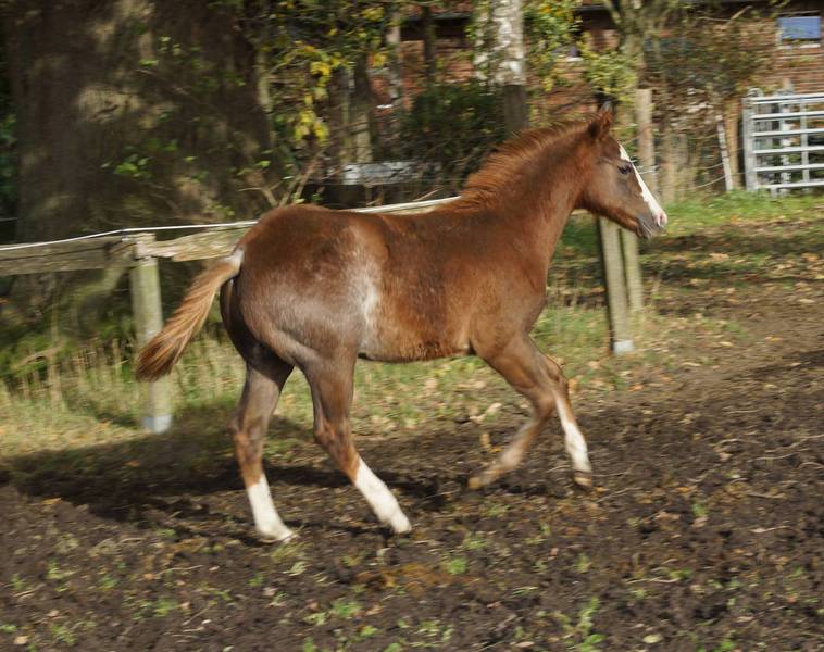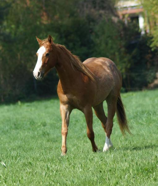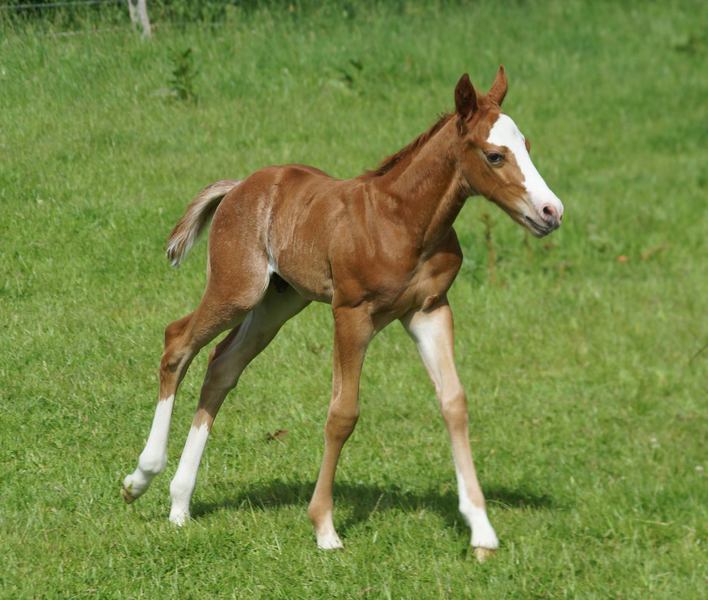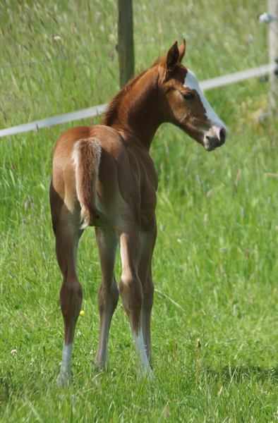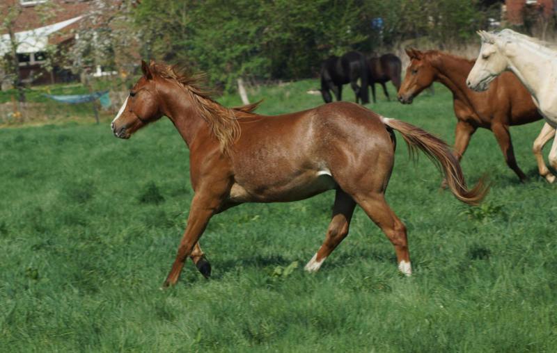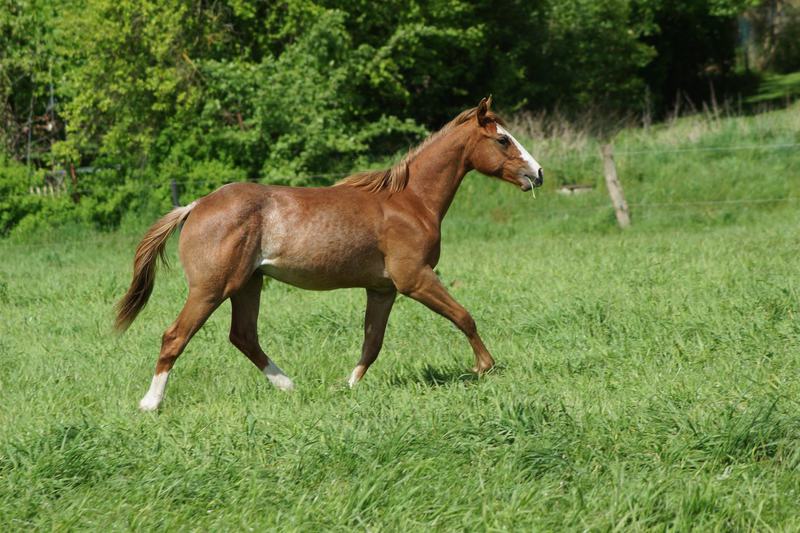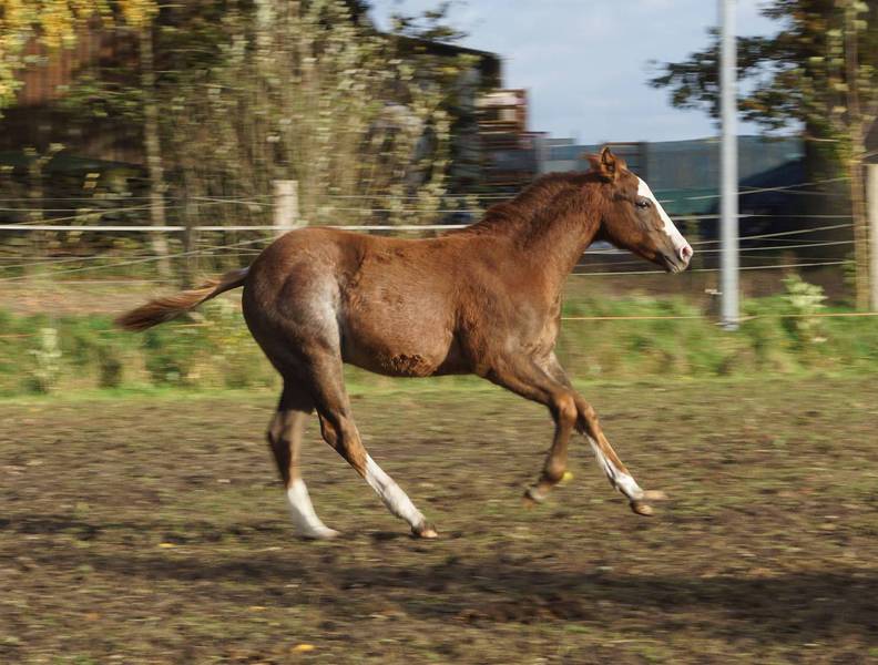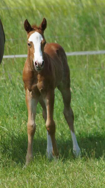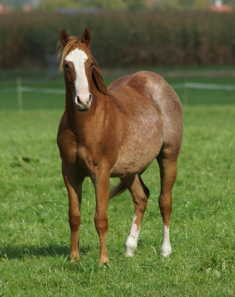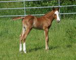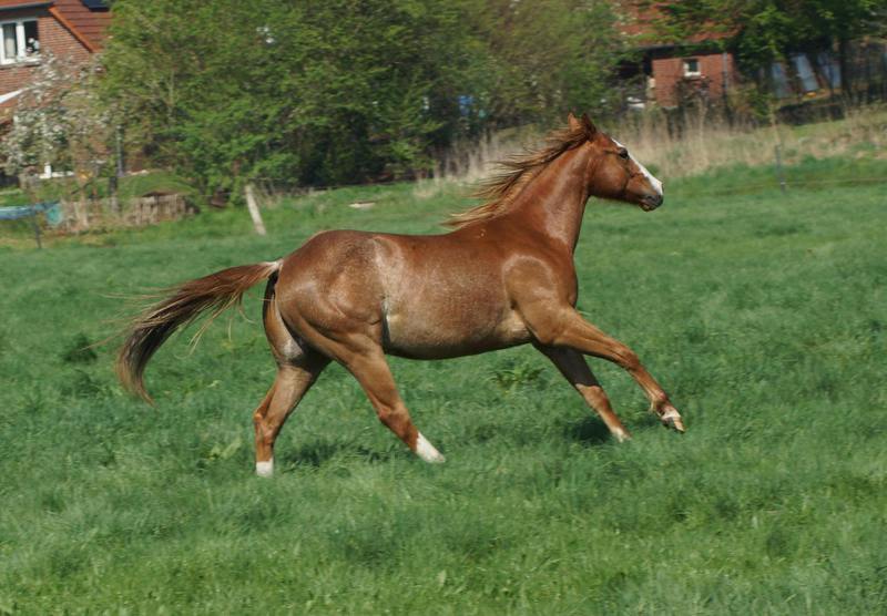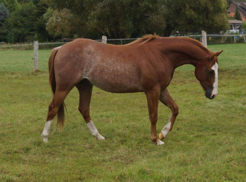Er ist ein kompakter korrekter Hengst in sorrel mit rabicano. Katzenhafte Bewegungen lassen eine tolle Karriere