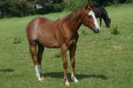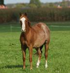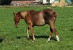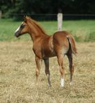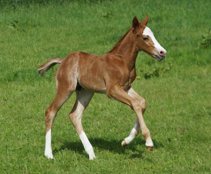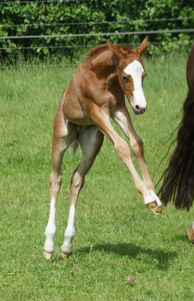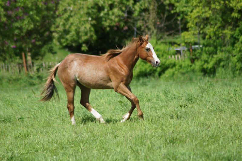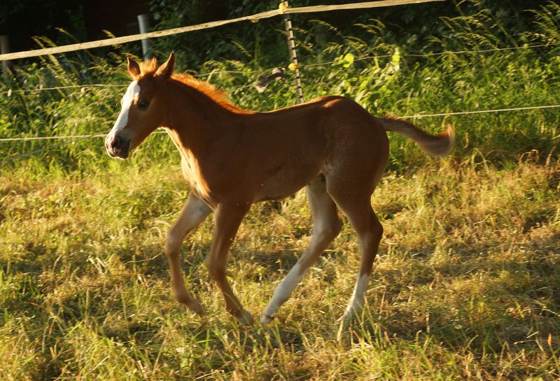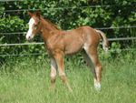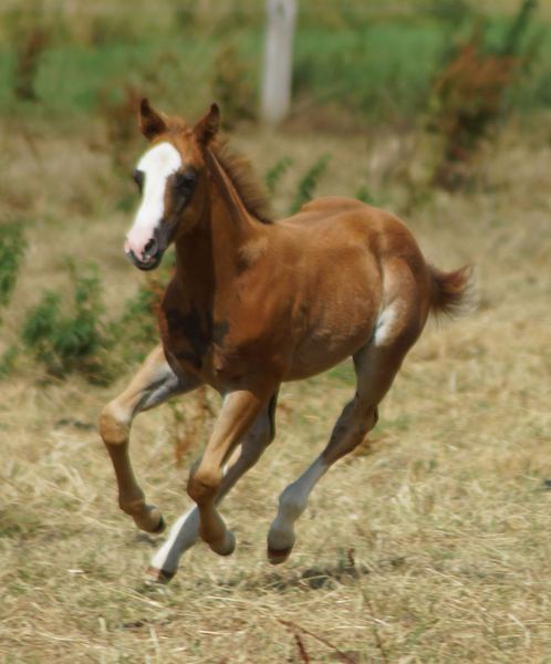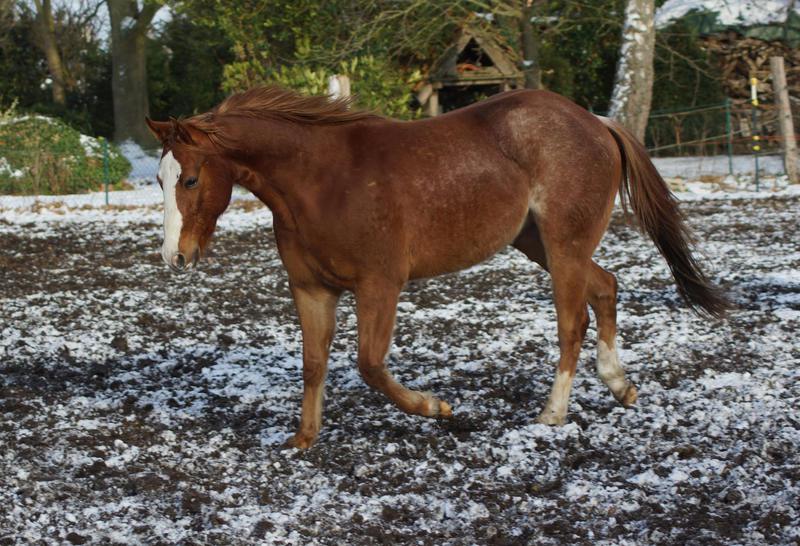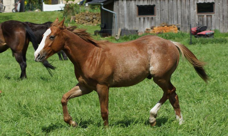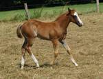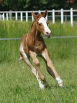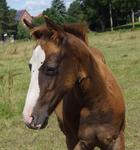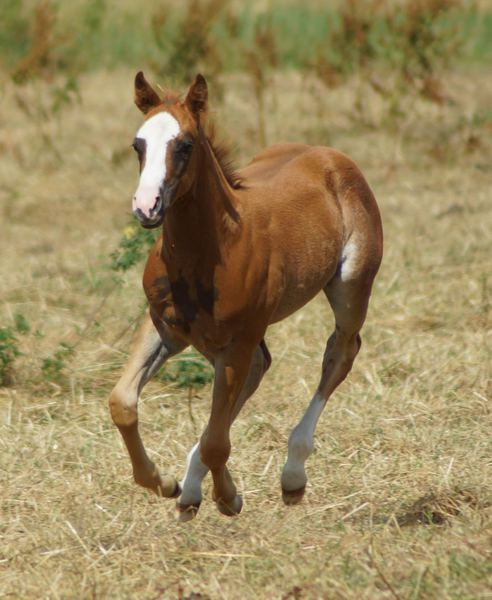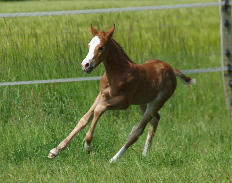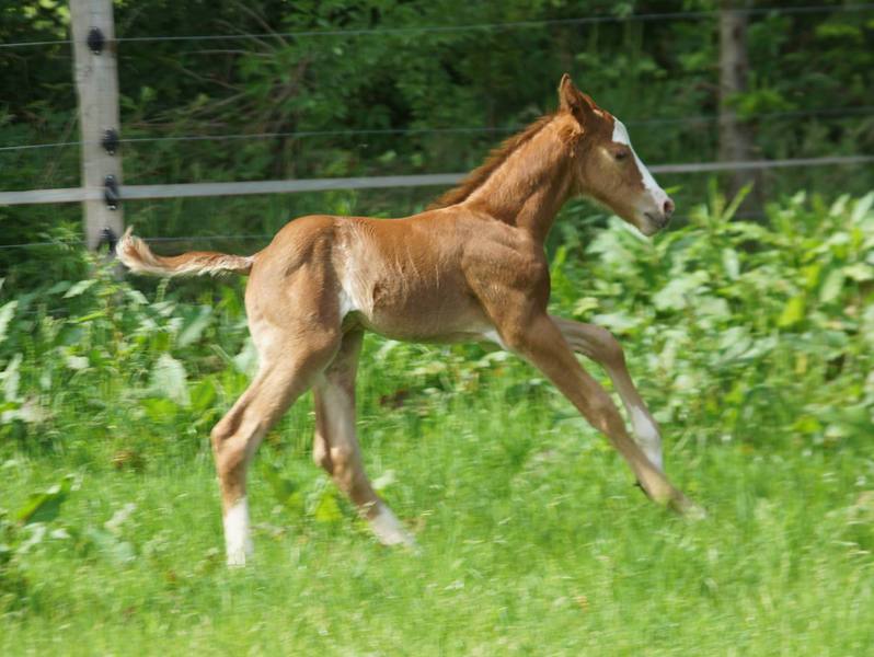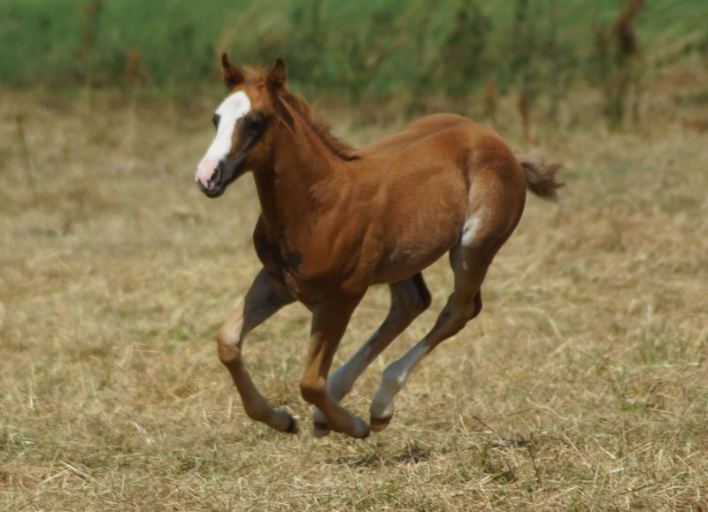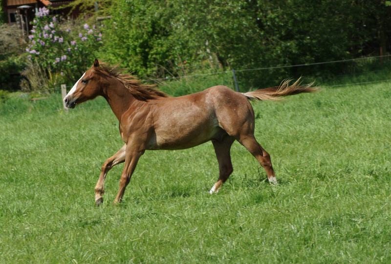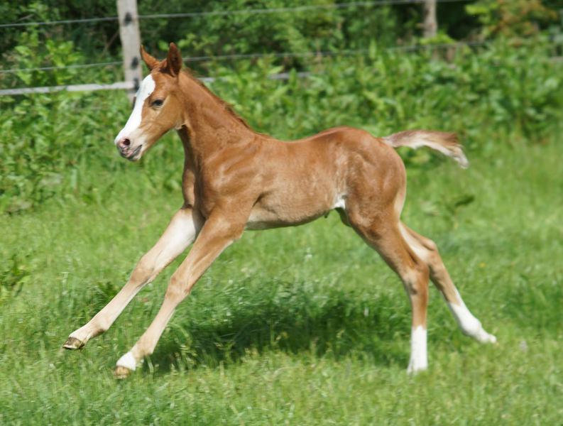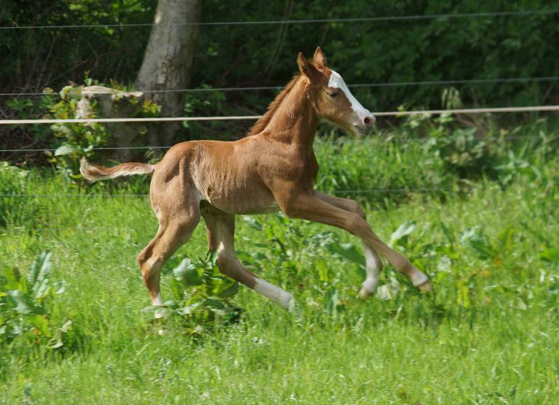 Er ist ein kompakter korrekter Hengst in sorrel mit rabicano. Katzenhafte Bewegungen lassen eine tolle Karriere