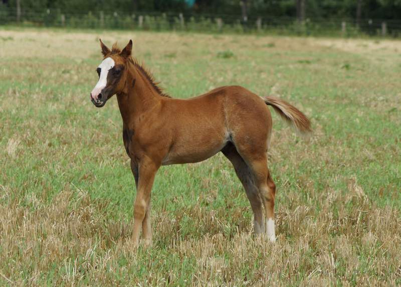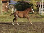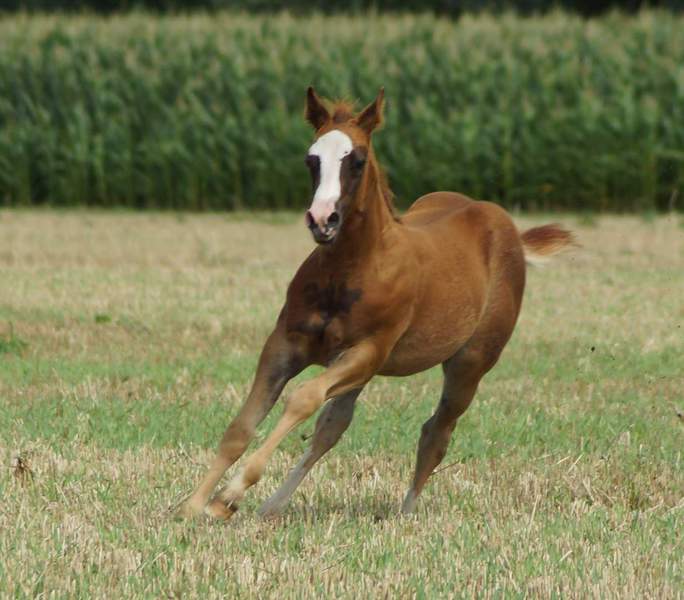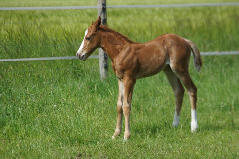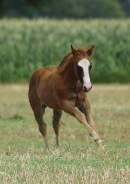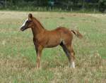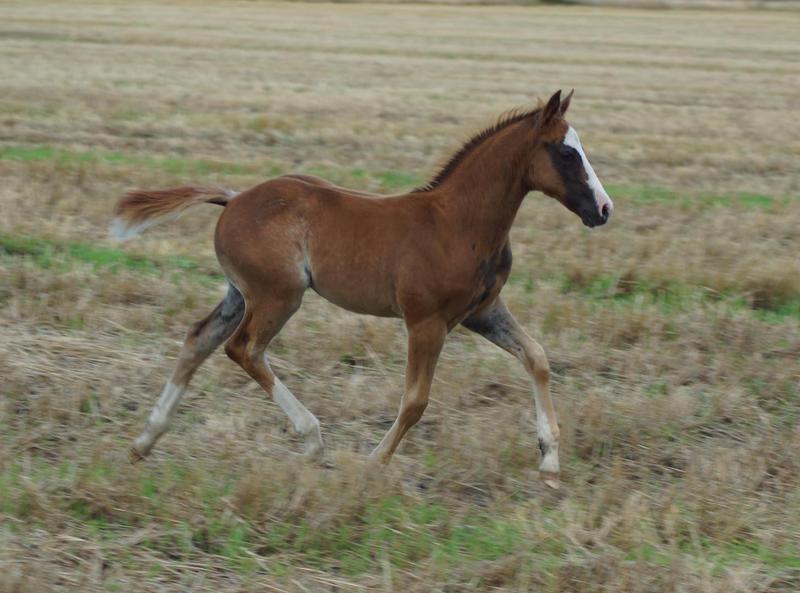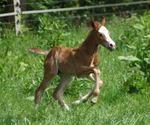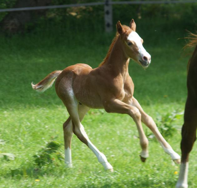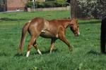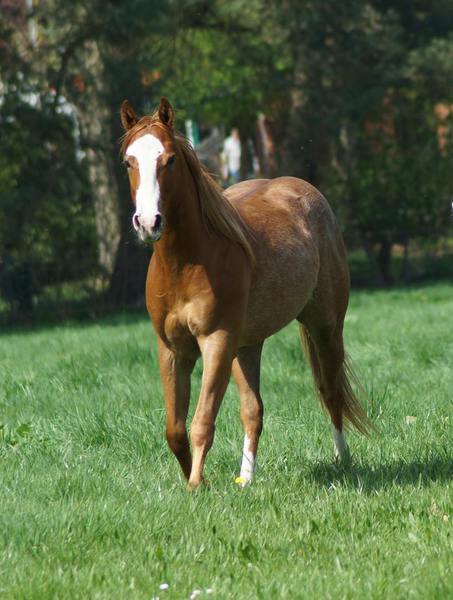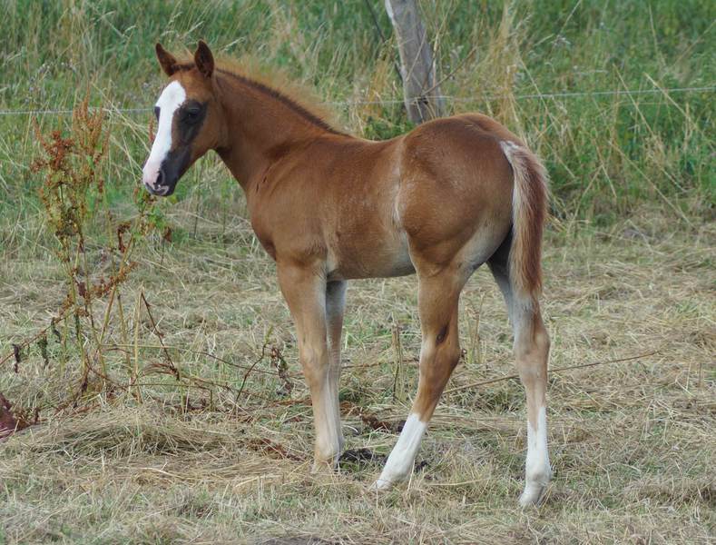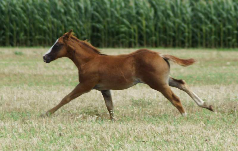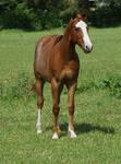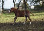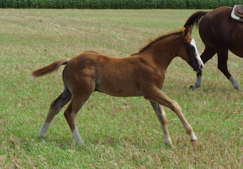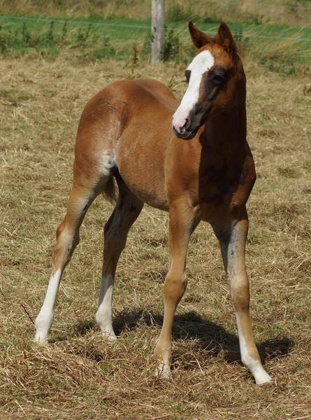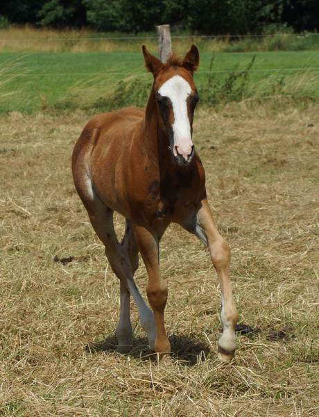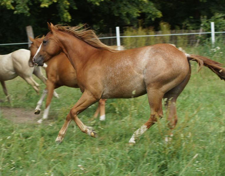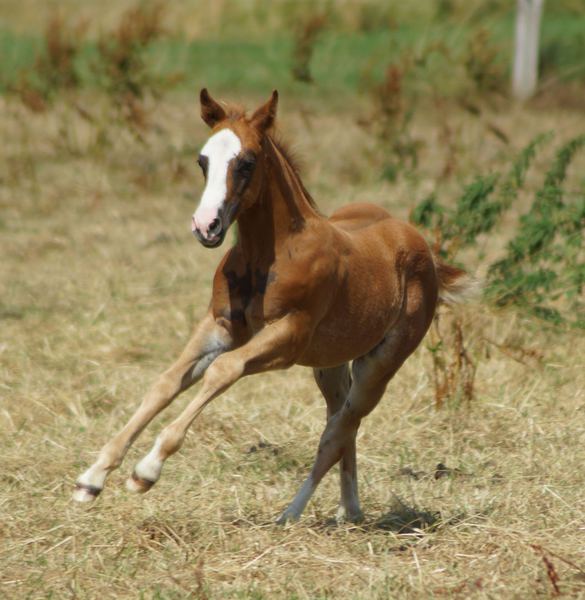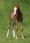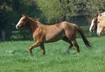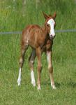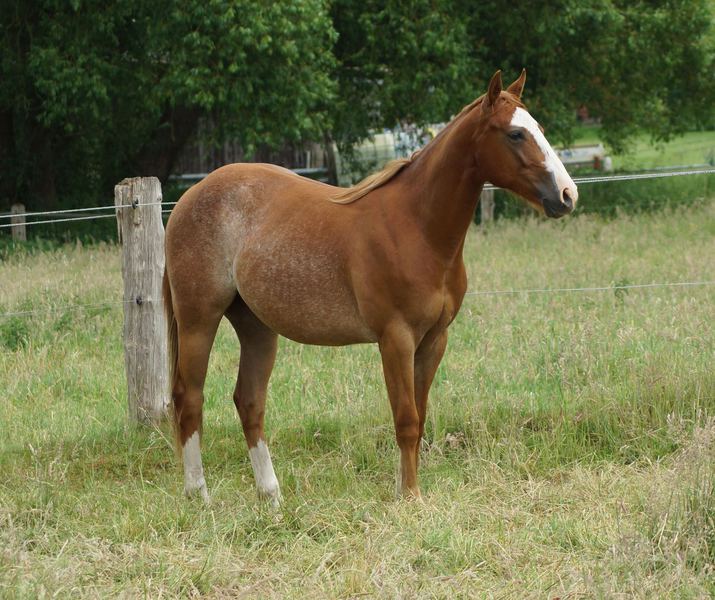 Er ist ein kompakter korrekter Hengst in sorrel mit rabicano. Katzenhafte Bewegungen lassen eine tolle Karriere