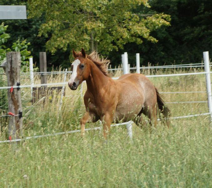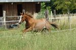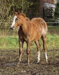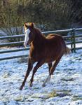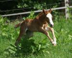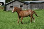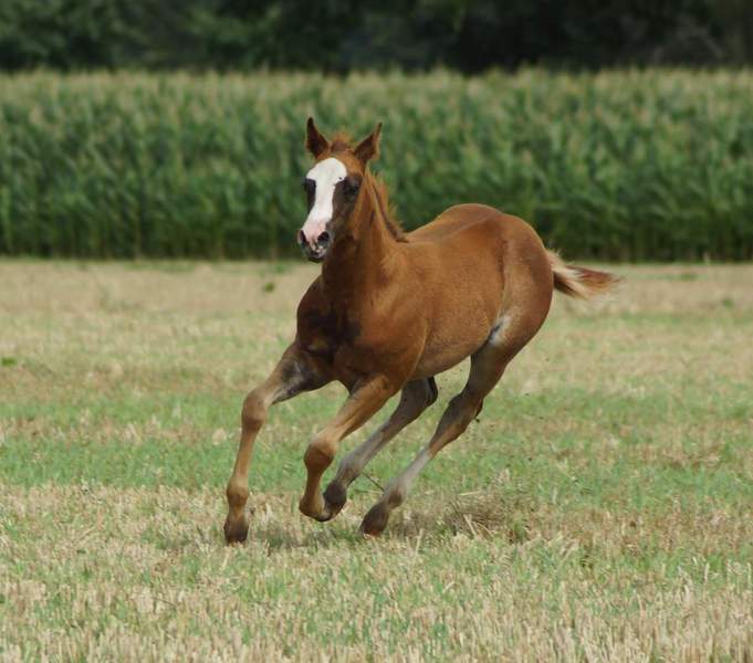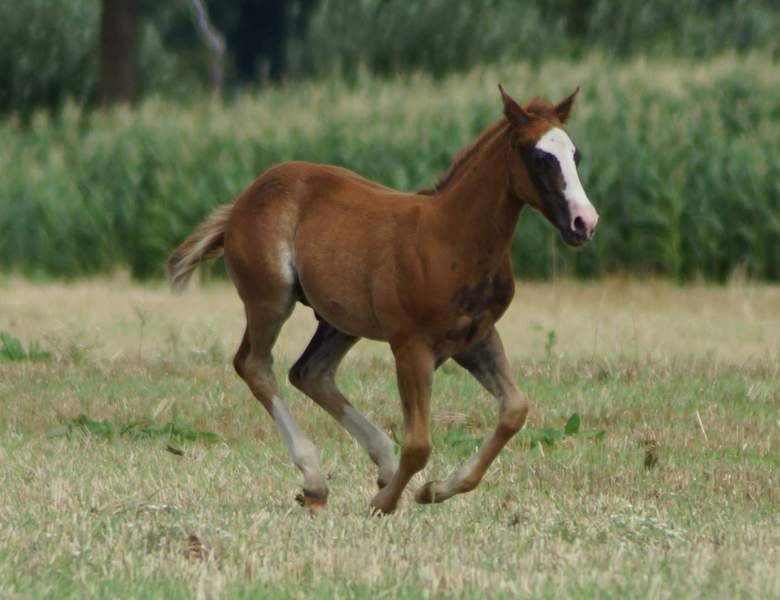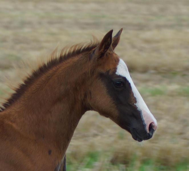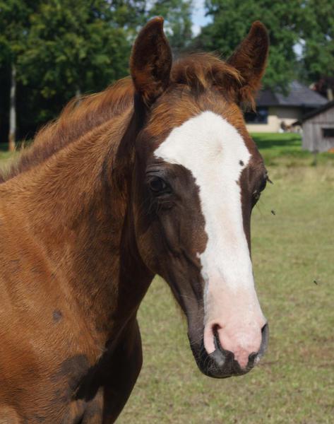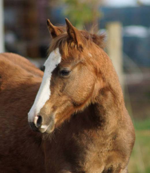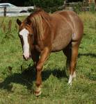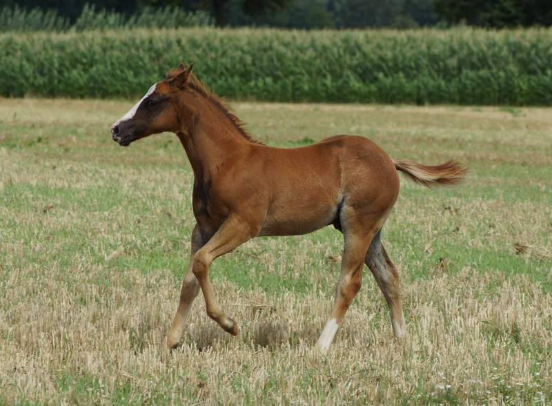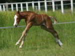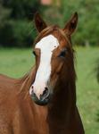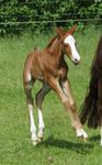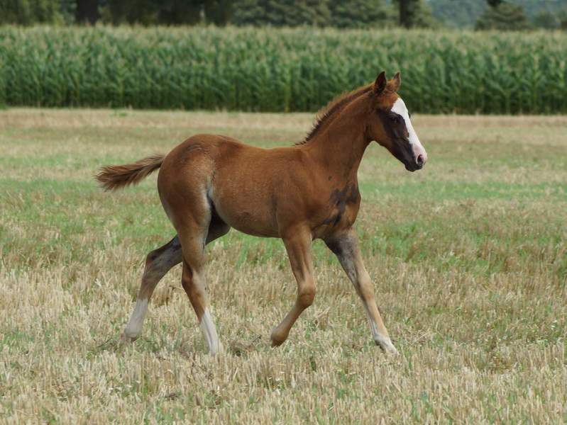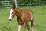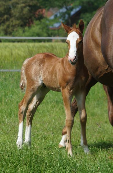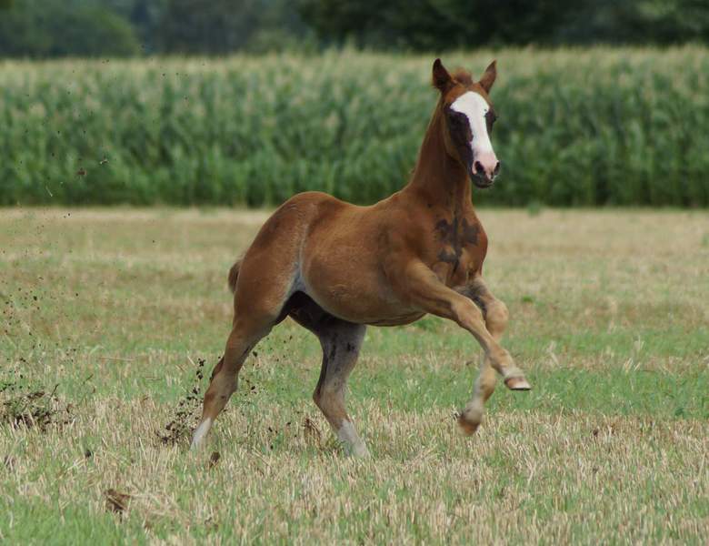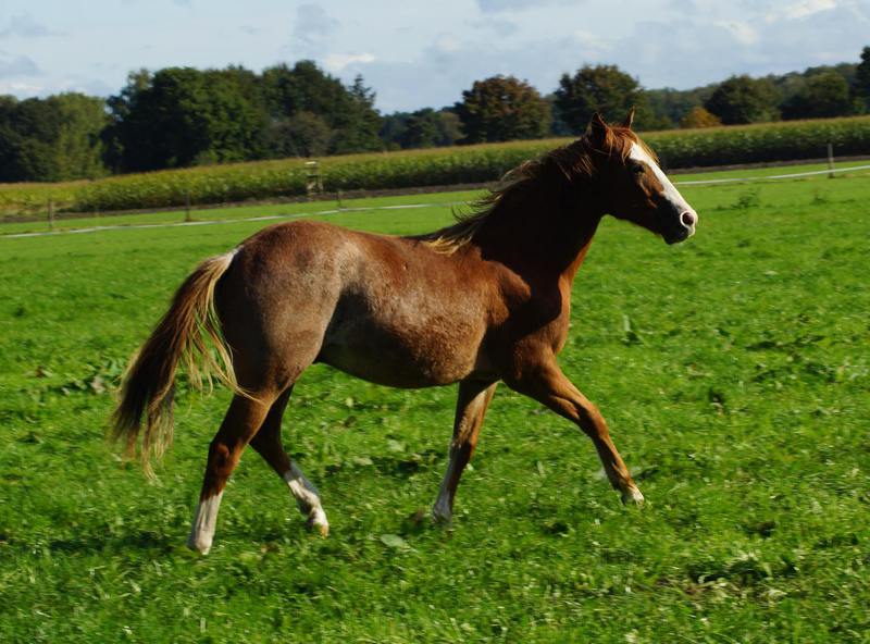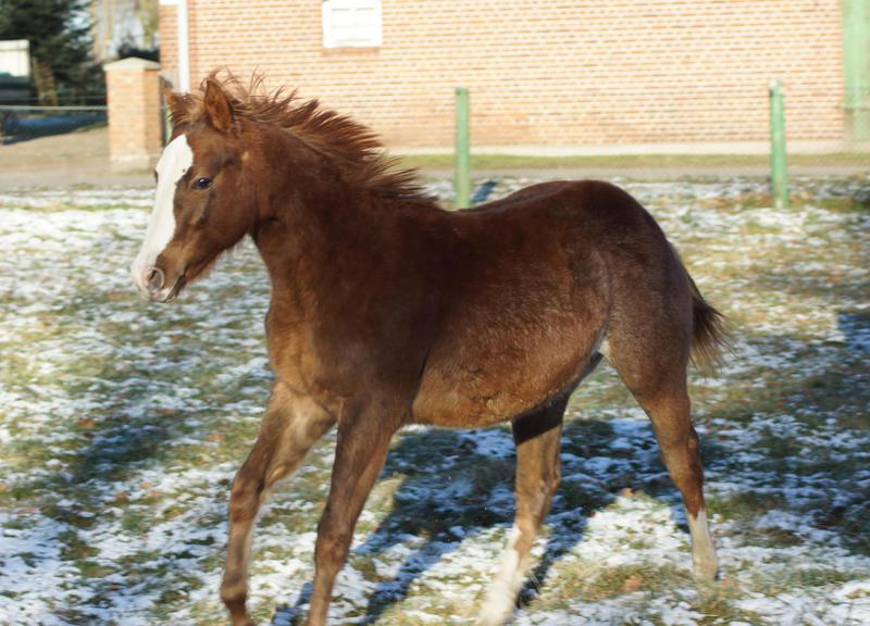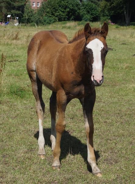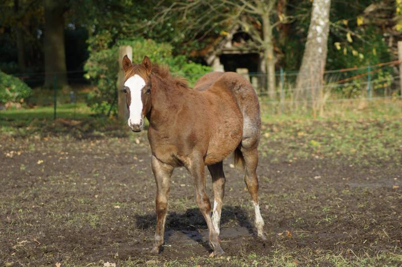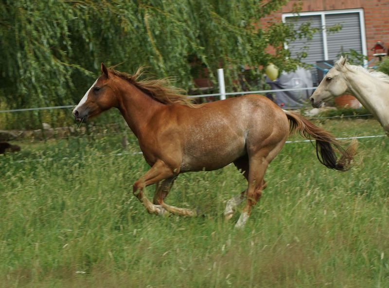 Er ist ein kompakter korrekter Hengst in sorrel mit rabicano. Katzenhafte Bewegungen lassen eine tolle Karriere
