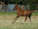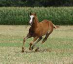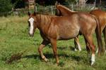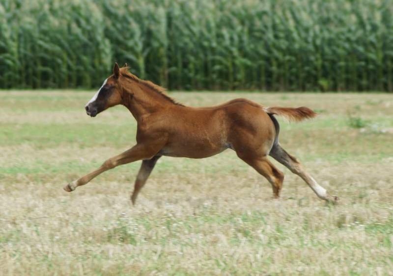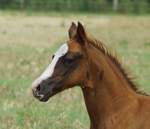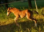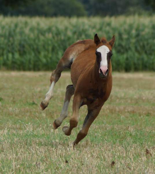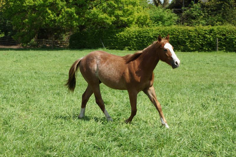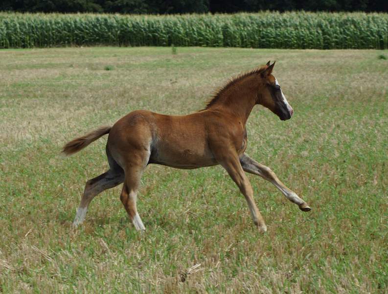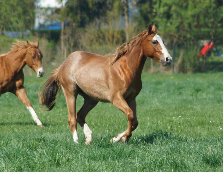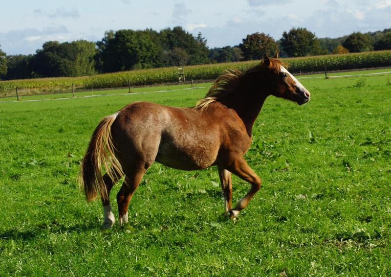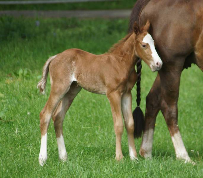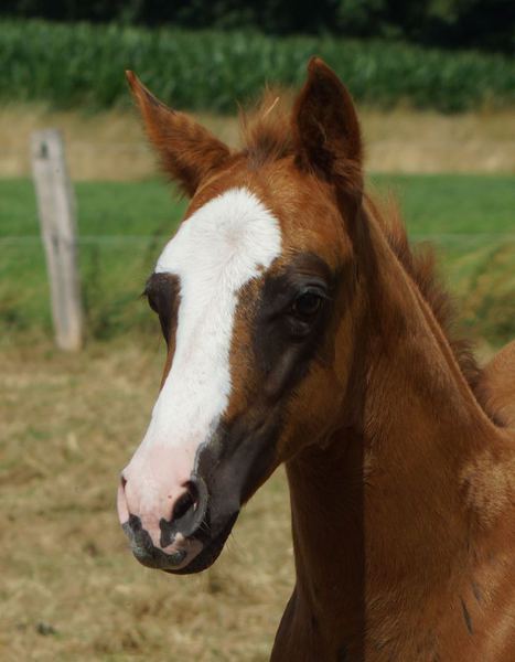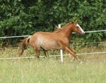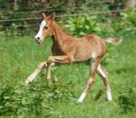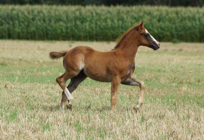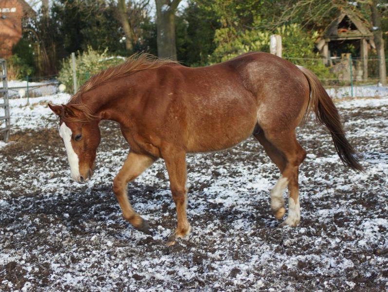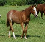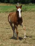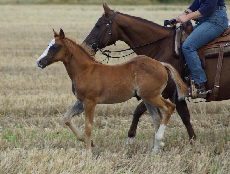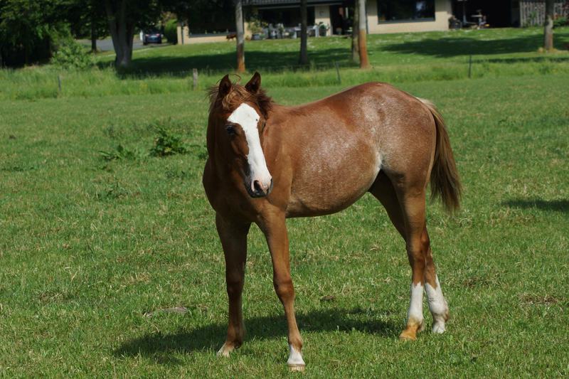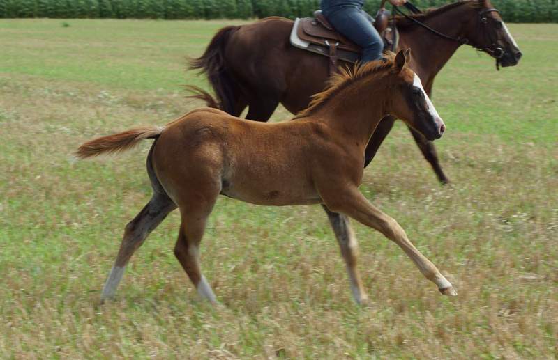 Er ist ein kompakter korrekter Hengst in sorrel mit rabicano. Katzenhafte Bewegungen lassen eine tolle Karriere
