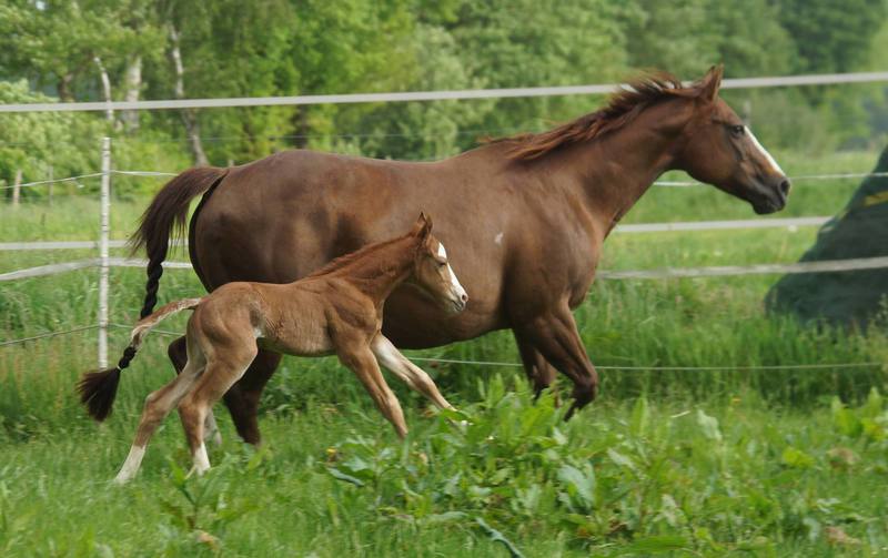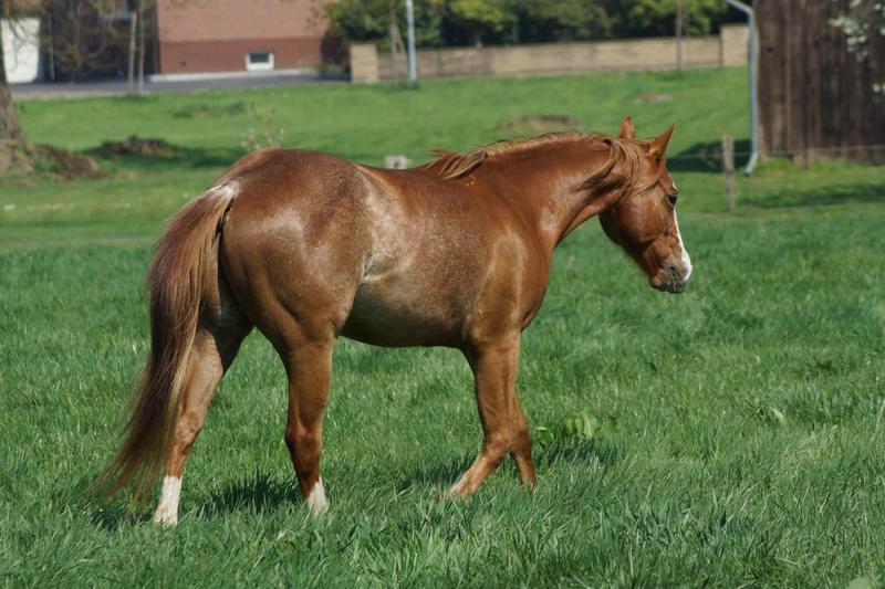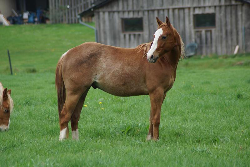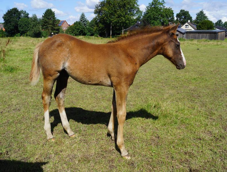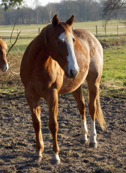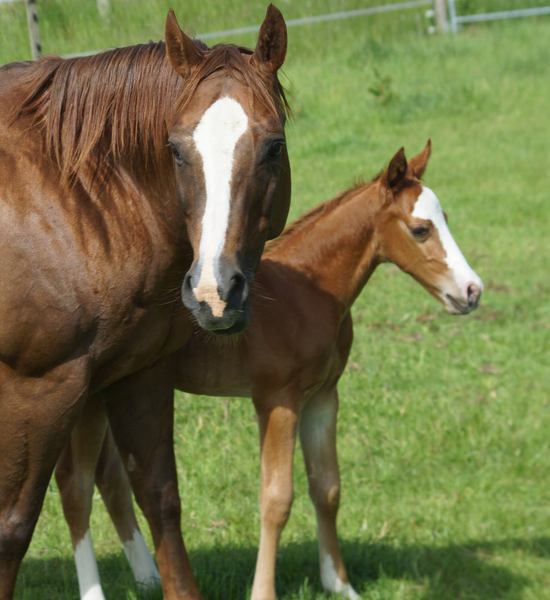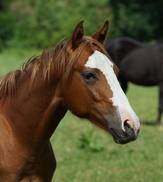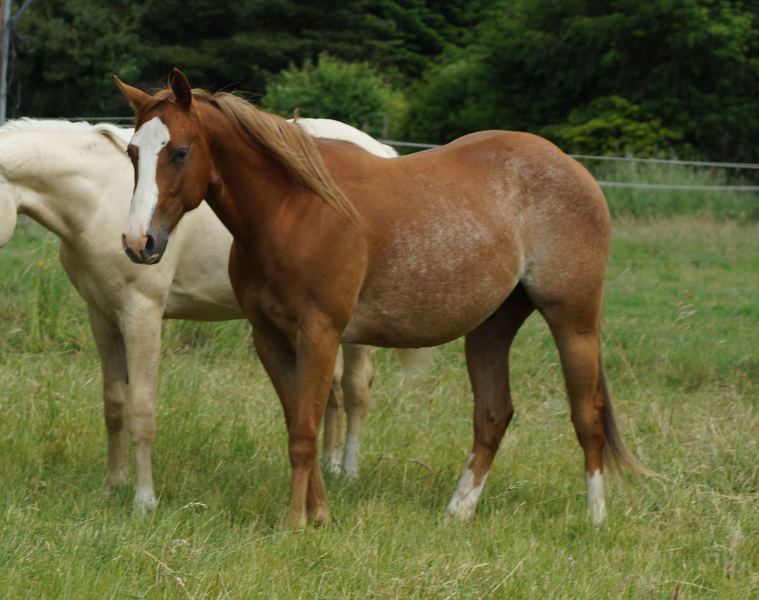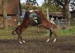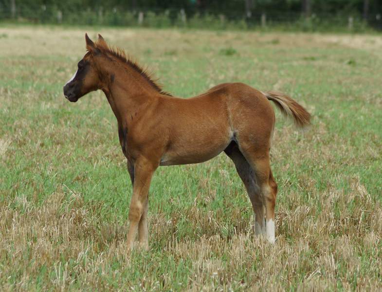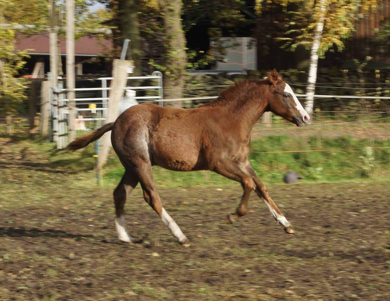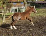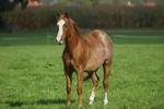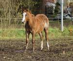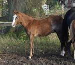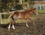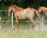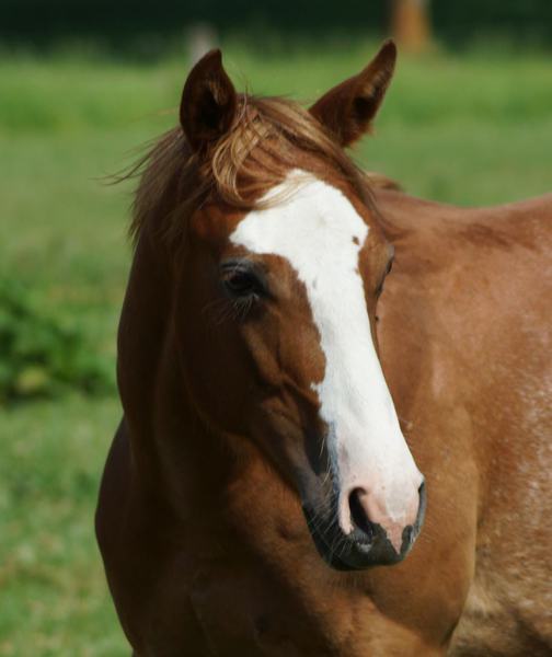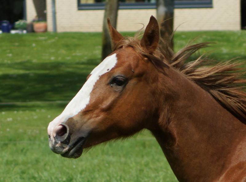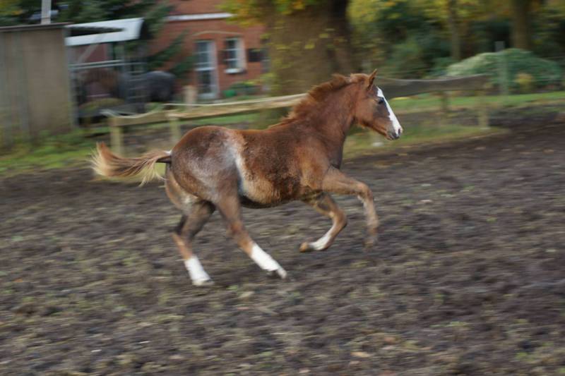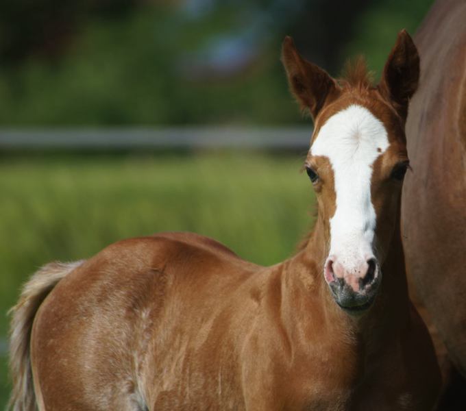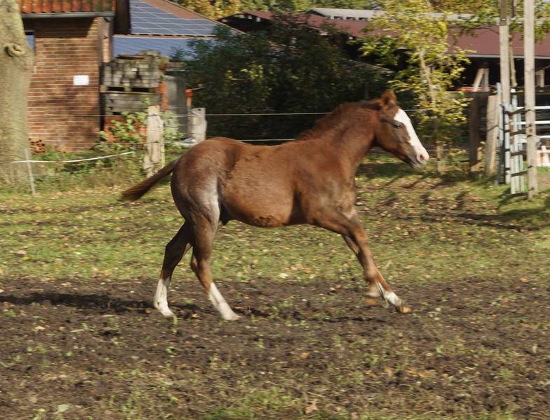 Er ist ein kompakter korrekter Hengst in sorrel mit rabicano. Katzenhafte Bewegungen lassen eine tolle Karriere