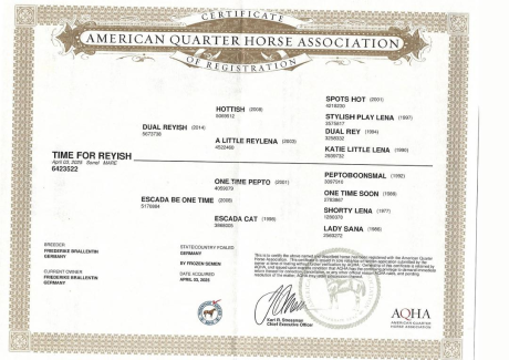 Um 12 Uhr mittags am 03.04.2025 brachte unsere Escada mitten in der Herde auf dem Paddock ein wunderschönes sorrel rabicano Stutfohlen vom Top Cuttinghengst Dual Reyish zur Welt.