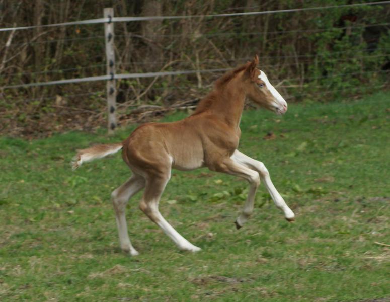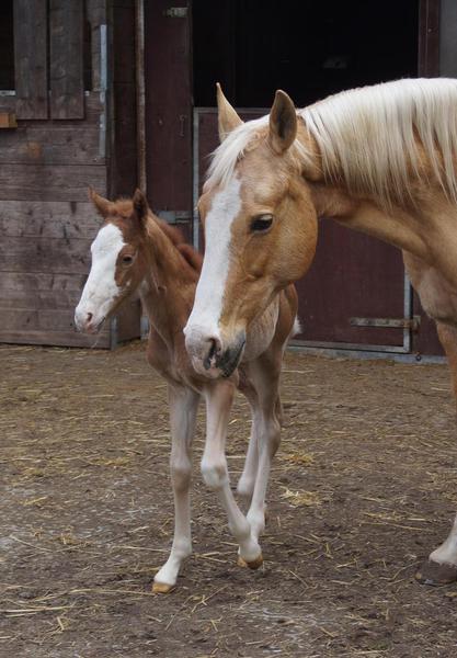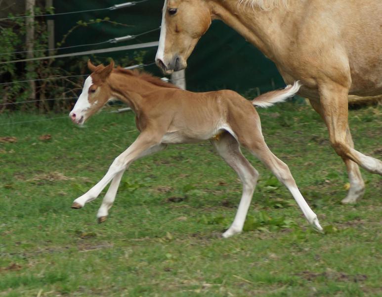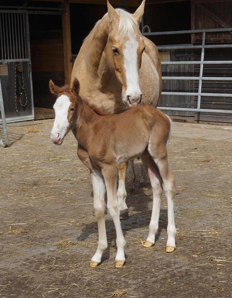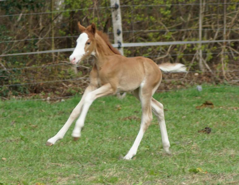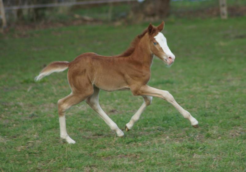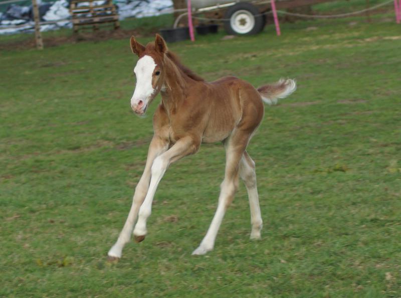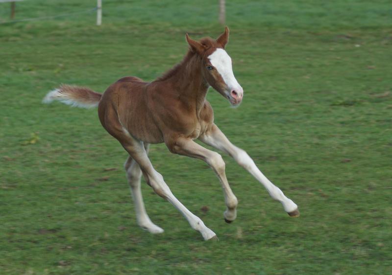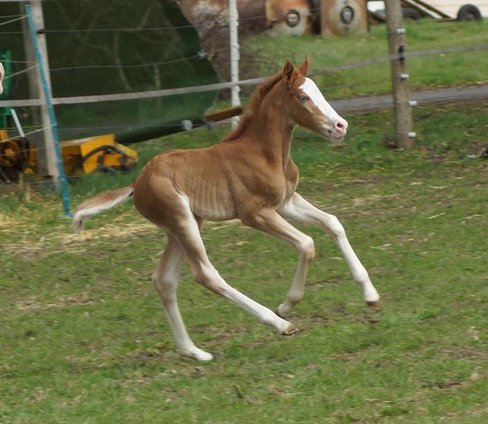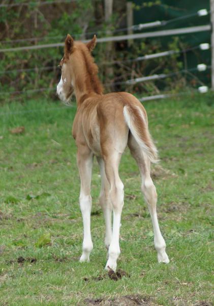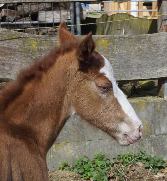 Sie ist ein langbeiniges sorrel Stütchen mit viel Chrome und einem braunen und einem blauen Auge. Hailey hat einen korrekten Körperbau und kräftiges Fundament.