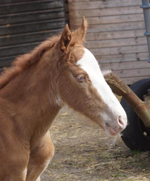 On 03.04.2026 Hailey hit the ground. She is a big boned sorrel filly with splash and a blue and a brown eye and is correct build.
