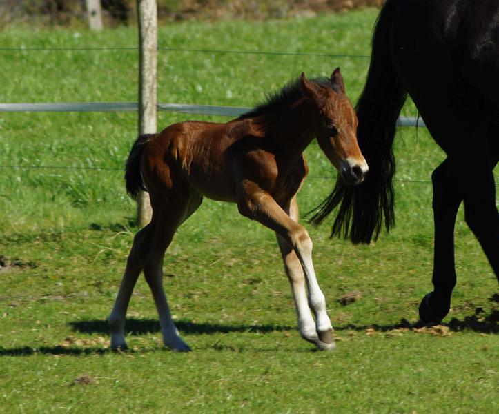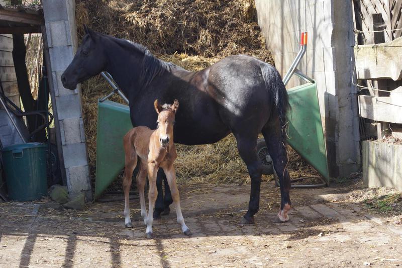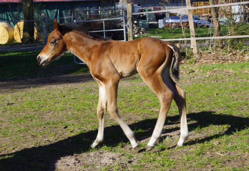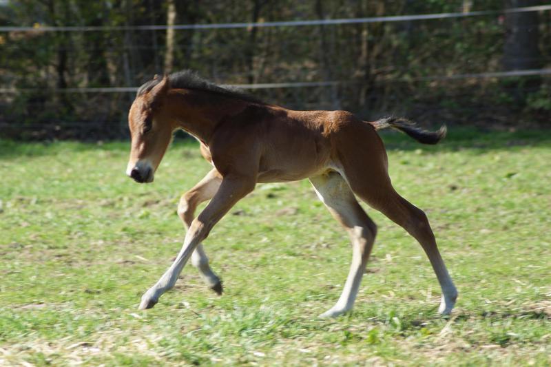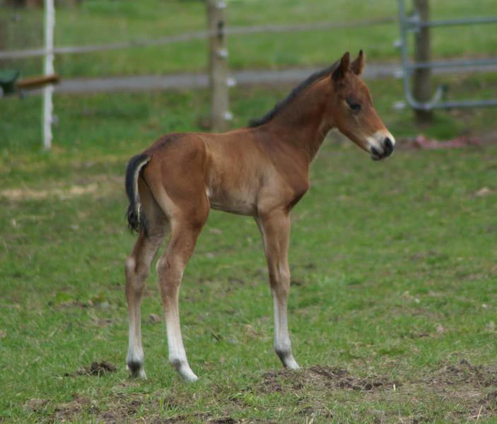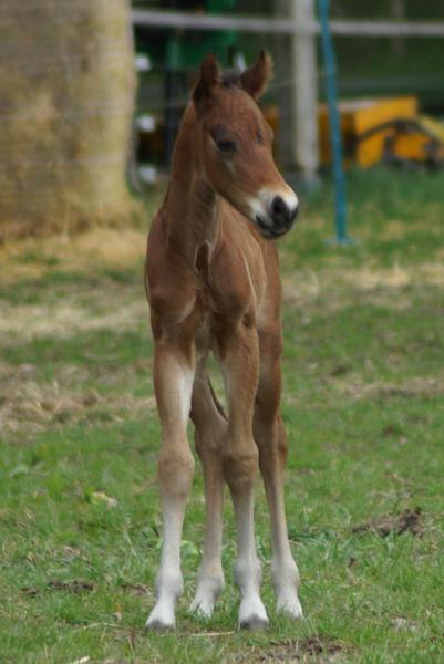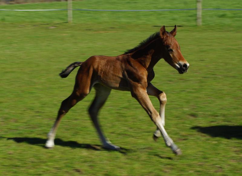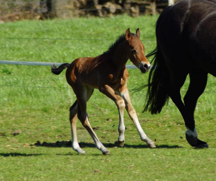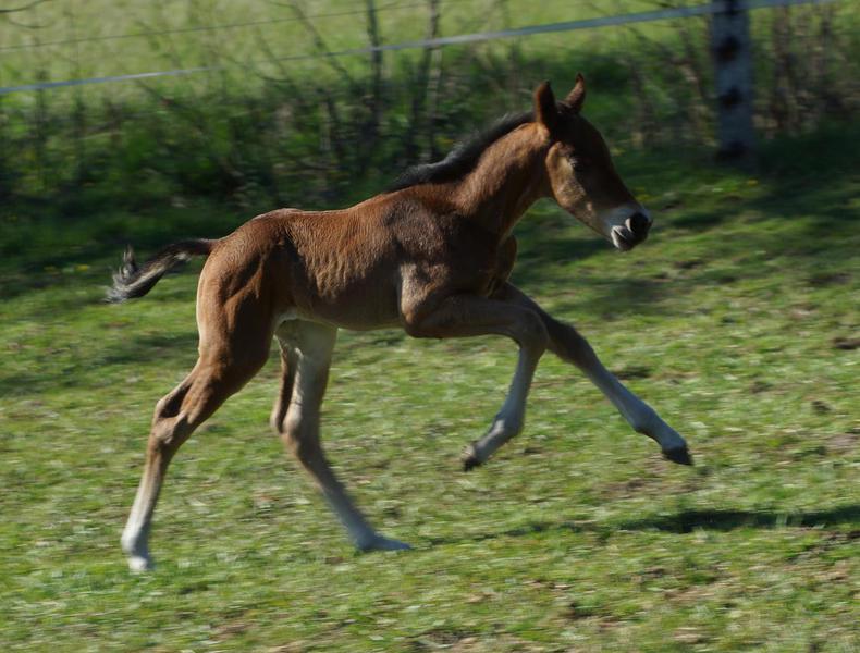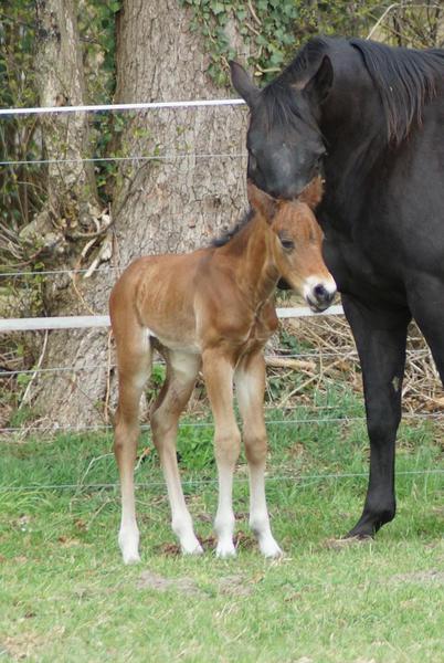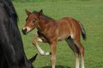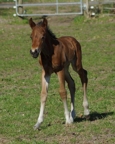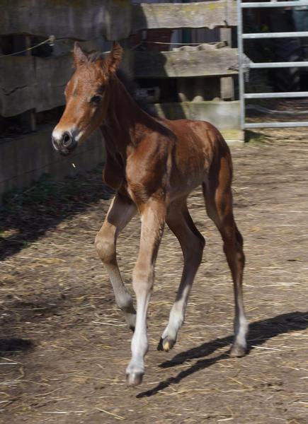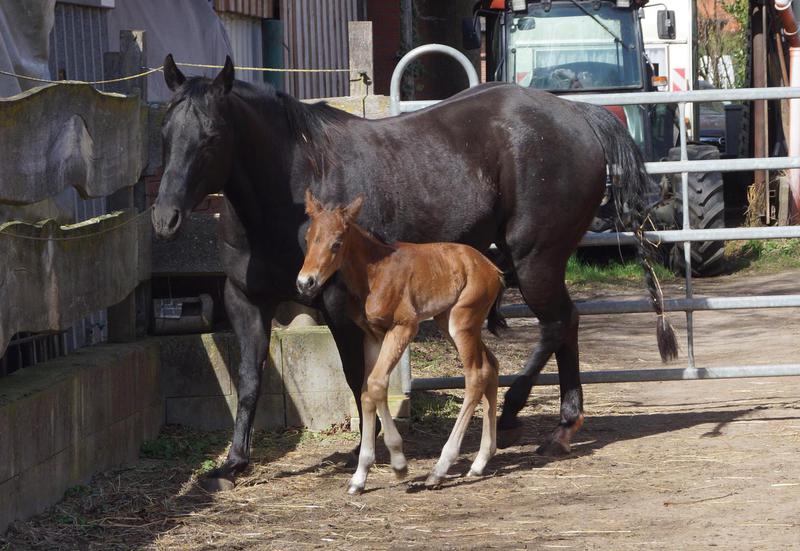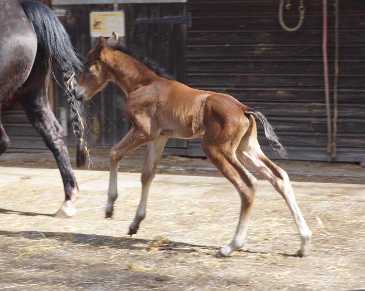 Der kleine braune Mann war schnell auf den Beinen und hat auch zügig die Milchbar erobert. Er ist ein kompakter Hengst mit kräftigem Fundament und geraden Beinen.