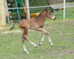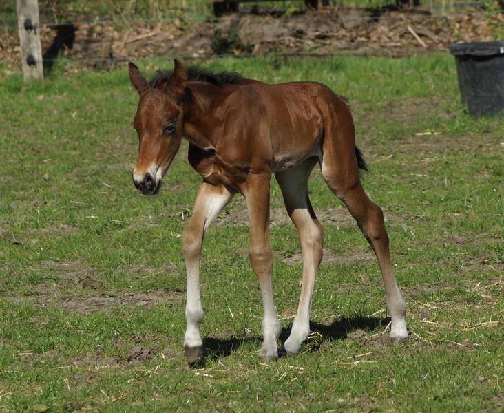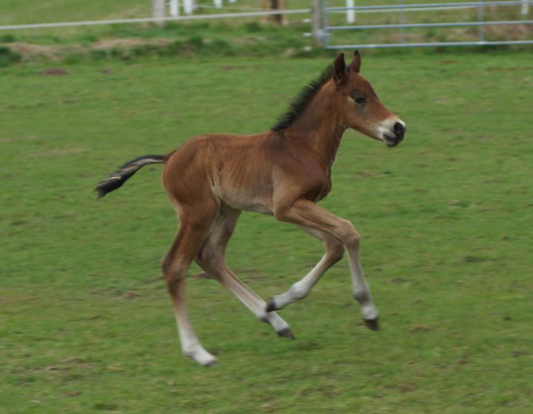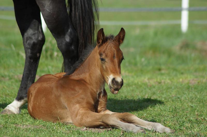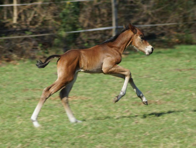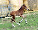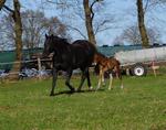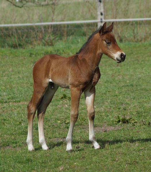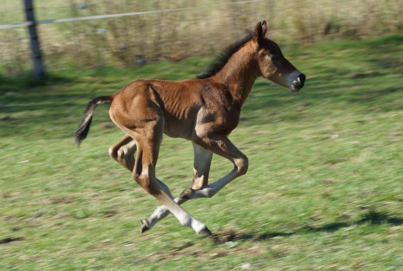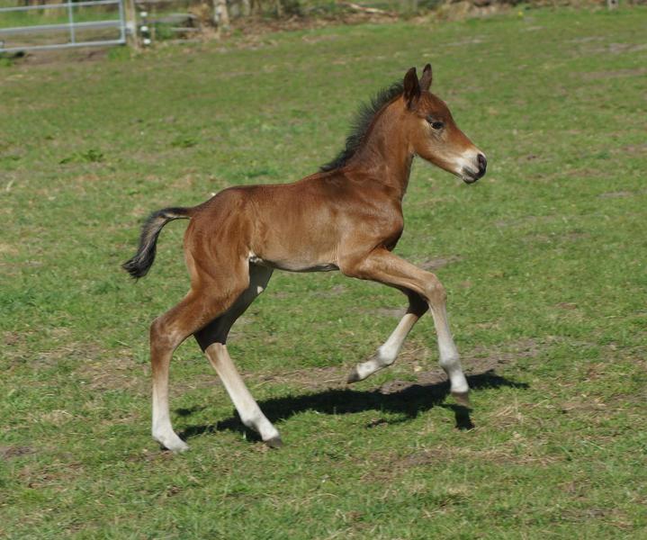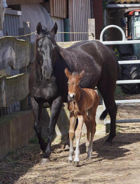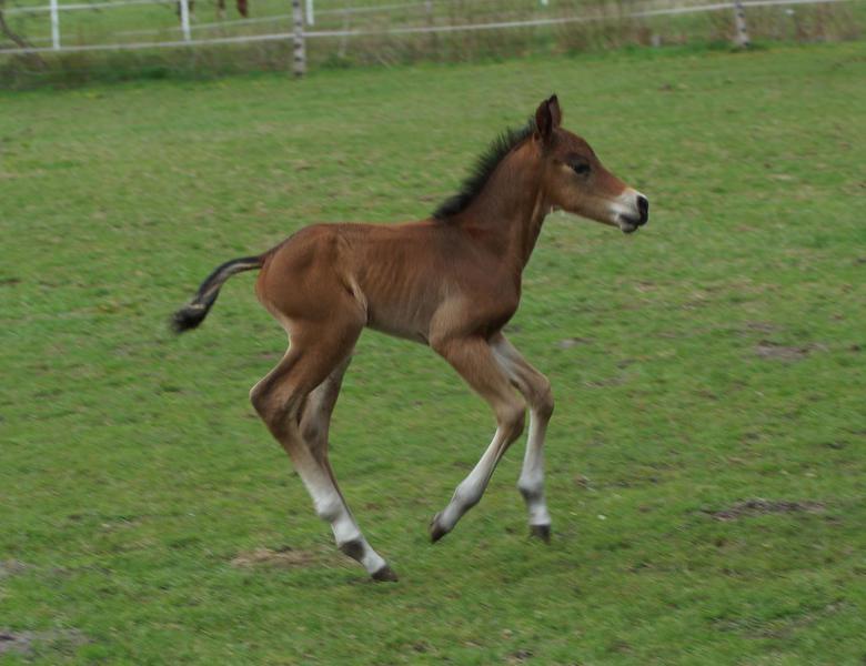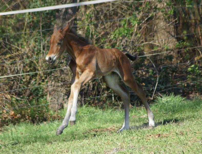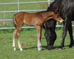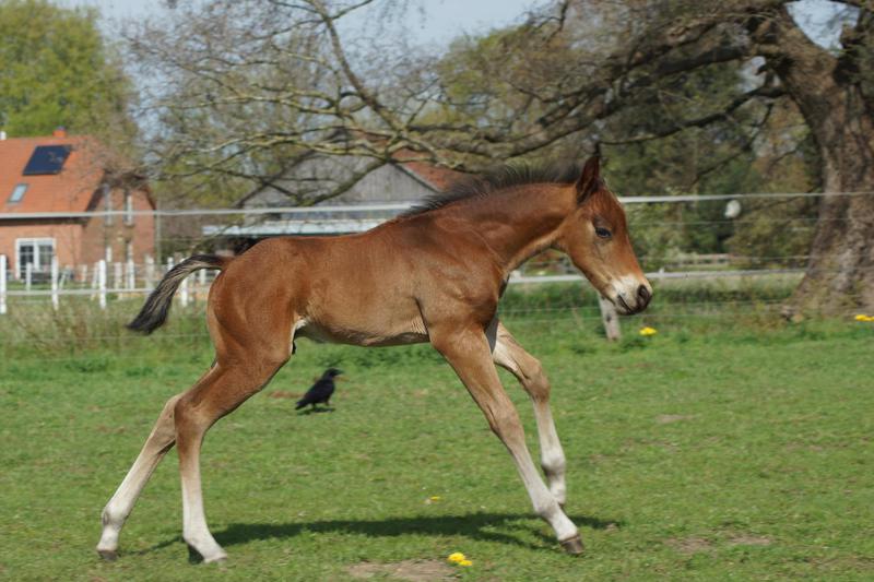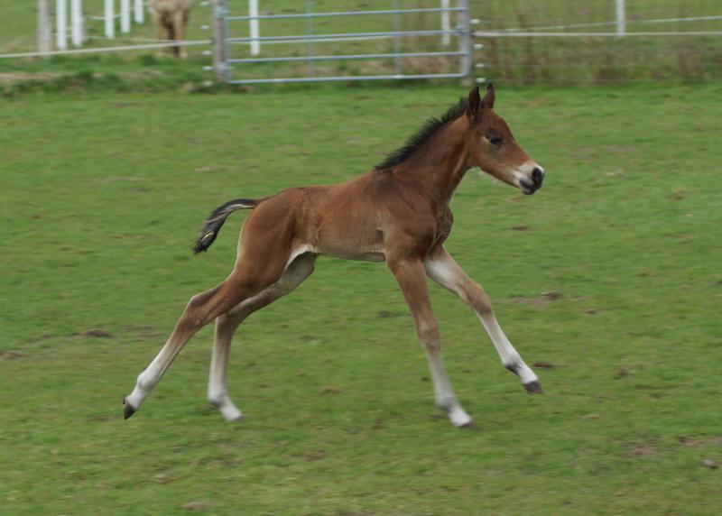 Der kleine braune Mann war schnell auf den Beinen und hat auch zügig die Milchbar erobert. Er ist ein kompakter Hengst mit kräftigem Fundament und geraden Beinen.