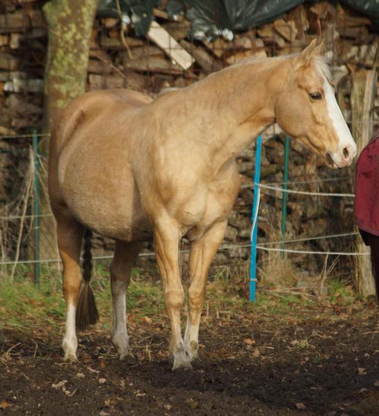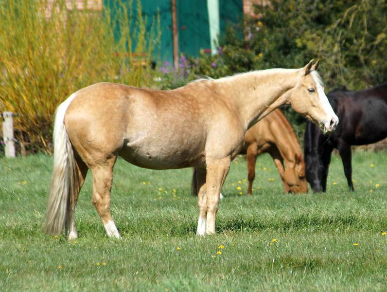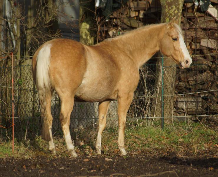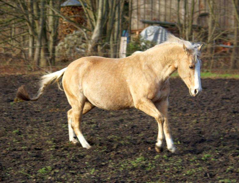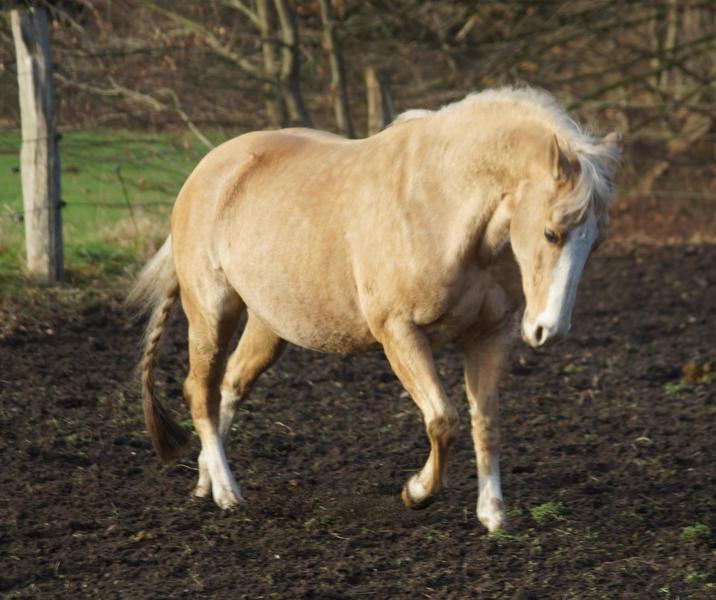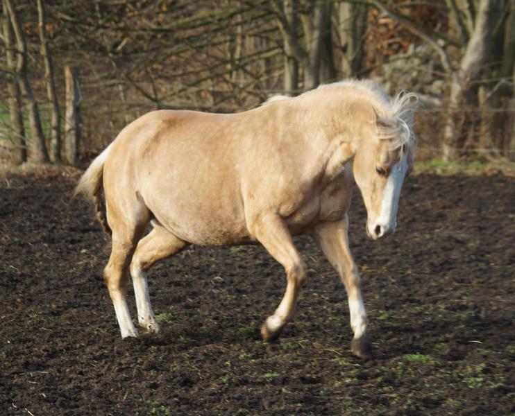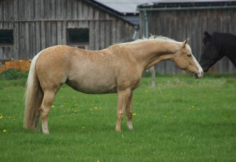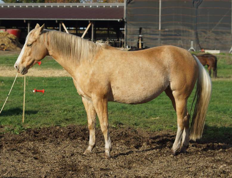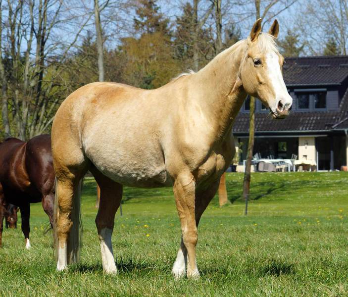 Blondi is well build with big bones and in Palomino rabicano.