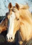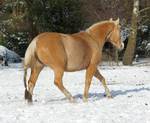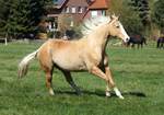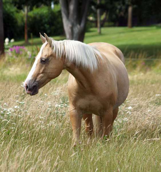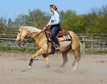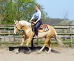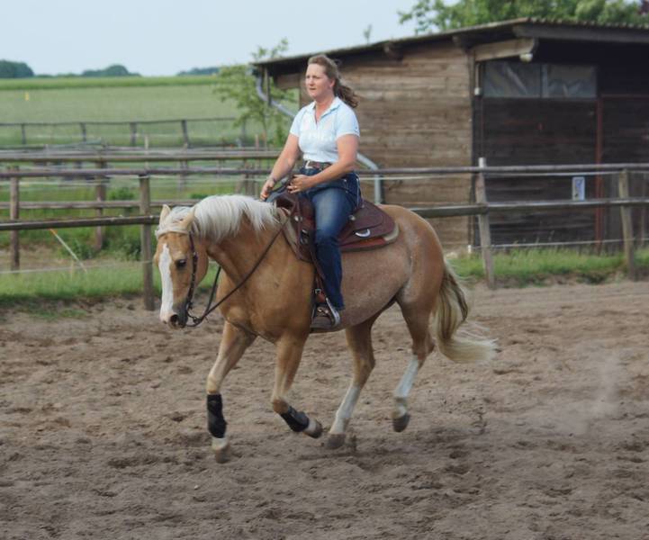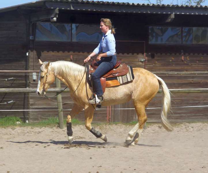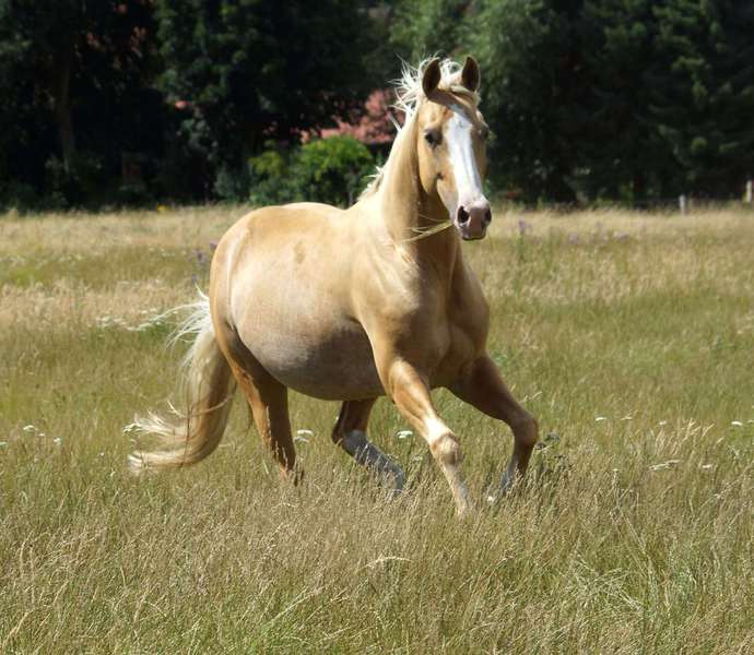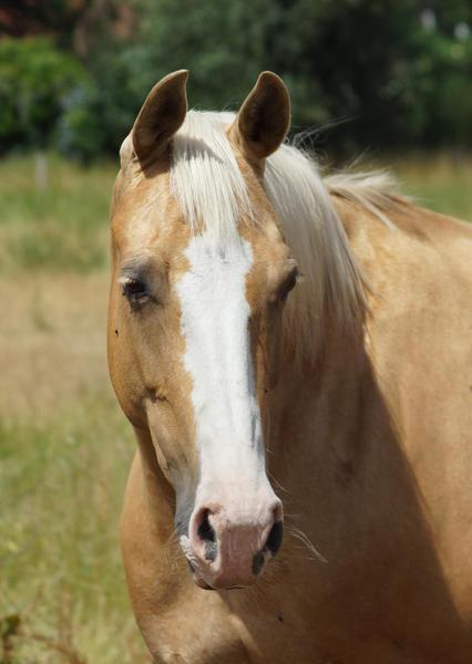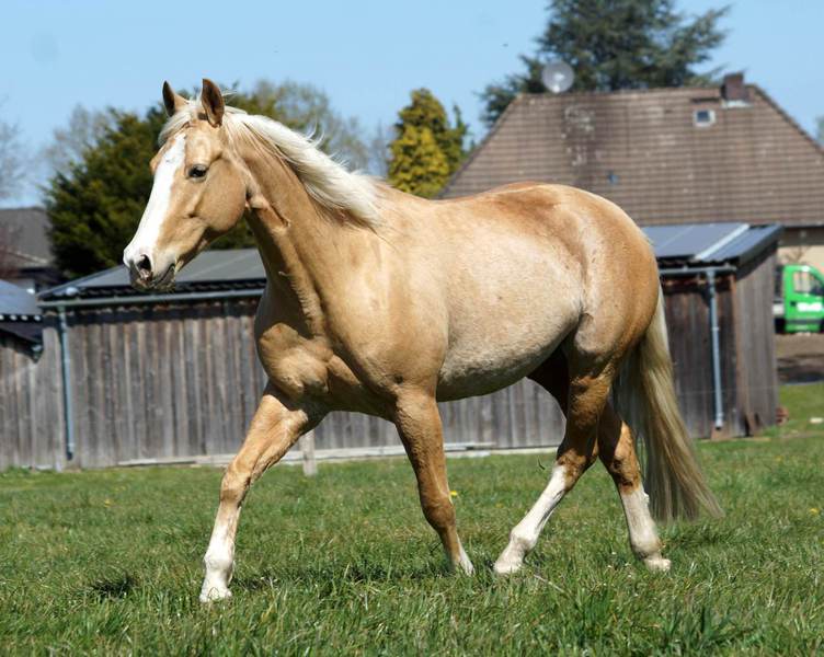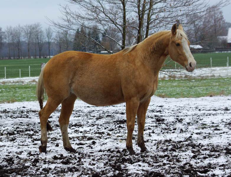 Blondi ist eine großrahmige Stute in Palomino rabicano mit 4 x Weiß gestiefelt und Blesse.